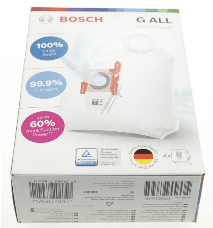 - Bosch In'genius ProSilence - BGL8330/03, BGL8330/05, BGL8330/08, BGL8400/03, BGL8400/05, BGL8400/08, BGL8407/03, BGL8407/05, BGL8407/08, BGL85Q57/08, BGL85Q57/10, BGL85S330/08, BGL85S330/10, BGL85SIL4/08, BGL85SIL4/10, BGL85SIL57/08, BGL85SIL57/10, BGL8ALL2/03, BGL8ALL2/05, BGL8ALL2/08, BGL8ALL2/10, BGL8ALL4/03, BGL8ALL4/05, BGL8ALL4/08, BGL8ALL4/10